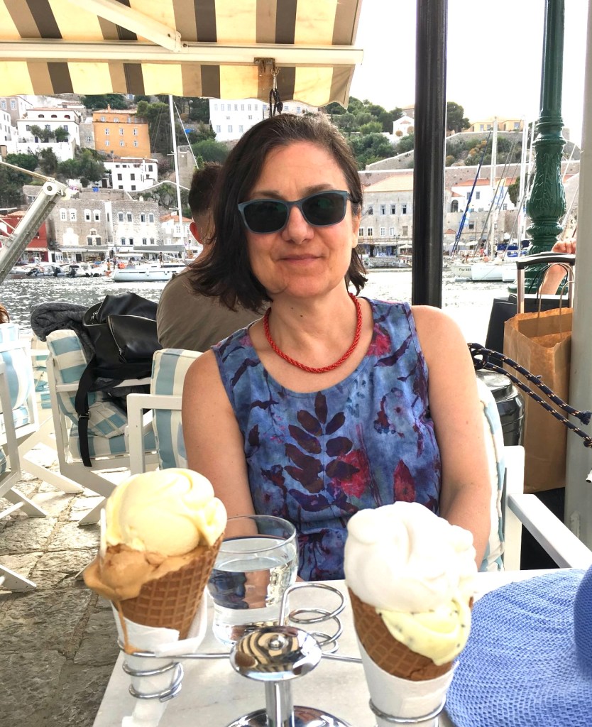 While I’m not sure about an ice cream café on Hydra’s harbor in 1973, I drew on my own ice cream experience from the same trip. And yes, the ice cream was as delicious as it looks.