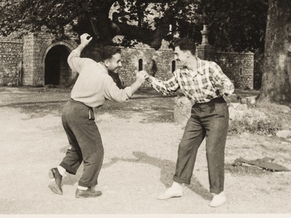 Cleo’s description of the photo of her dad as a teen dancing the jitterbug with his friend before he immigrated to America derives from a photo of my father doing just that in the 1950s. My dad is the dancer on the left. In terms of culture, my Greek uncle in Nea Smyrni once pointed out to my mother (who was not Greek) and me that we were arguing too quietly and should raise our voices and dramatically wave our arms in the air when we disagree. I also drew on my own experiences of being approached by aggressive men on the streets of Athens when I was a teenager, which happens to Cleo too.